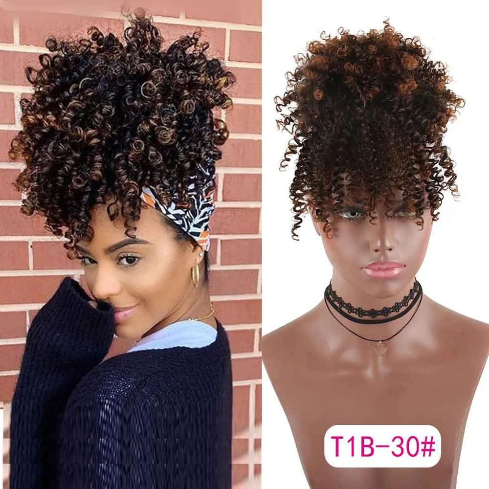 Vova High Puff Afro Kink Y Curly Bun With Bangs Synthetic Drawstring Ponytail Hairpiece Clip In On Wrap Updo Hair Extensions Donut Chignon Hairpieces