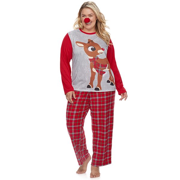 Plus Size Jammies For Your Families Rudolph The Red Nosed Reindeer Sleep Top Plaid Bottoms Pajama Set With Red Nose Accessory